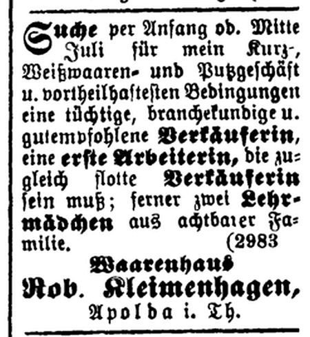 Größtes Handelsunternehmen in Apolda war bis 1937 das Kaufhaus von Wilhelm Rosewitz 'Am Schötener Grund' (Langemarckstraße); es war "größtes Modewaren- und Konfektionsgeschäft am Platze".