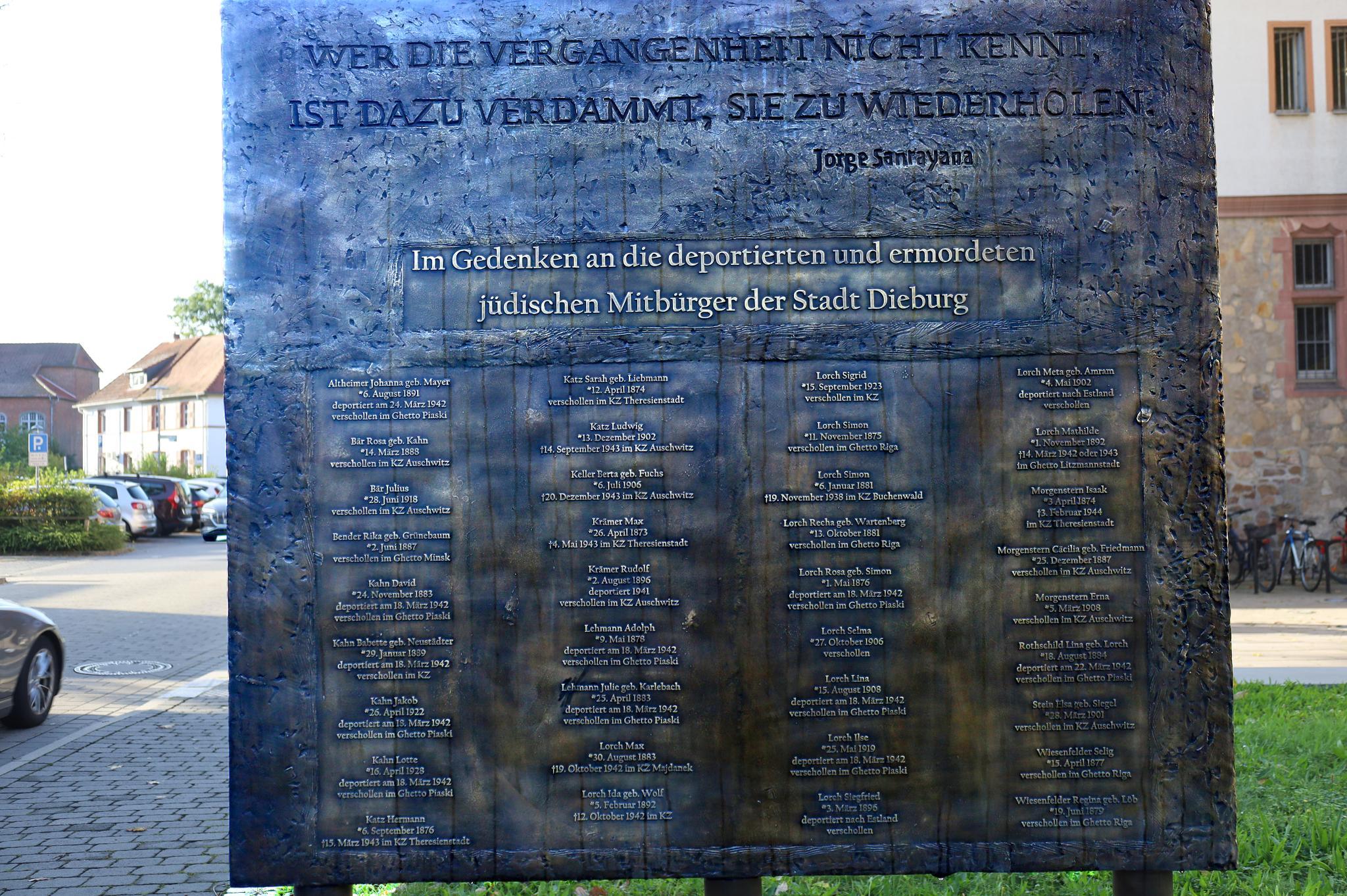 Am 11.November 1938 wurden jüdische Männer aus Dieburg und den Nachbargemeinden per Bus ins KZ Buchenwald verschleppt. Ein Großteil der Dieburger Juden emigrierte zumeist in die USA; andere verzogen in Orte innerhalb Deutschlands. 14 jüdische Bürger wurden 1942 direkt aus der Stadt deportiert.