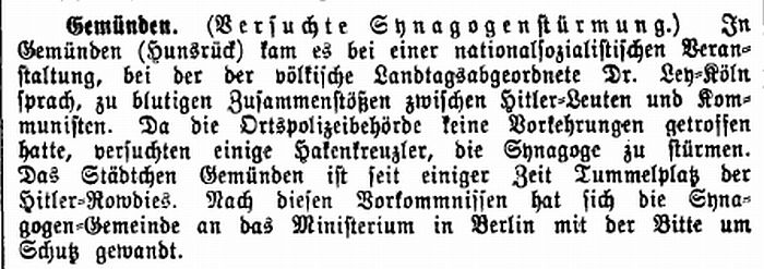 Anm.: Seit Beginn der 1920er Jahre entwickelte sich Gemünden zu einer Hochburg der NS-Bewegung; so soll es hier bereits 1920 zu ‚Saalschlachten’ zwischen ‚Juden und Nichtjuden’ gekommen sein. Aus den ‚alten Kämpfern’ Gemündens rekrutierten sich dann nach 1933 die Männer, die auch über die Region hinaus Führungsaufgaben übertragen bekamen.