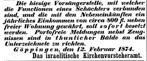 Anzeigen aus: "Allgemeine Zeitung des Judentums" vom 10.März 1874 und der Zeitschrift "Der Israelit" vom 13.März 1878