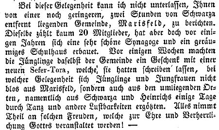 Einen Eindruck vom gemeindlichen Leben in Marisfeld gibt ein kurzer Artikel aus der „Allgemeinen Zeitung des Judenthums“ vom 30. November 1839: