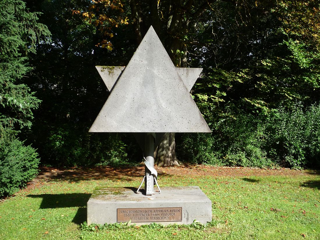 Ein 1990 in Form eines großen Davidsterns errichtetes Mahnmal an der Bürresheimer Straße (Aufn. Franz G. Bell) erinnert an die 77 deportierten und umgekommenen Juden Mayens; eine am Sockel des Gedenksteins angebrachte Inschrift lautet: "Zum Gedenken an die Juden aus Mayen. Einst Mitbürger, dann verfolgt, vertrieben, vernichtet." Rückseitig stehen die Worte: „Wir erkennen, Herr, unser Unrecht, die Schuld unserer Väter: Ja gegen dich gesündigt (Jer. 14,20)“