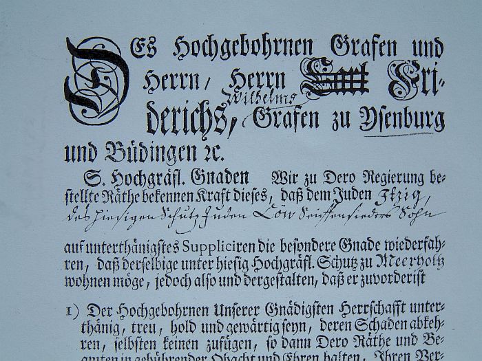 Schutzbrief für "Izig, des hiesigen Schutzjuden Löw Seiffensieder Sohn" (Staatsarchiv Marburg)
