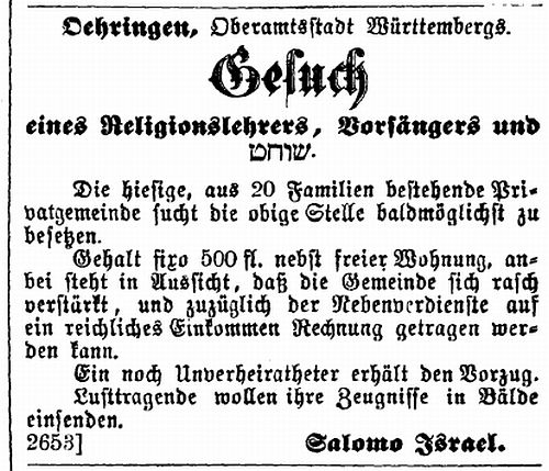Stellenangebot aus der Zeitschrift „Der Israelit“ vom 27.Okt. 1875