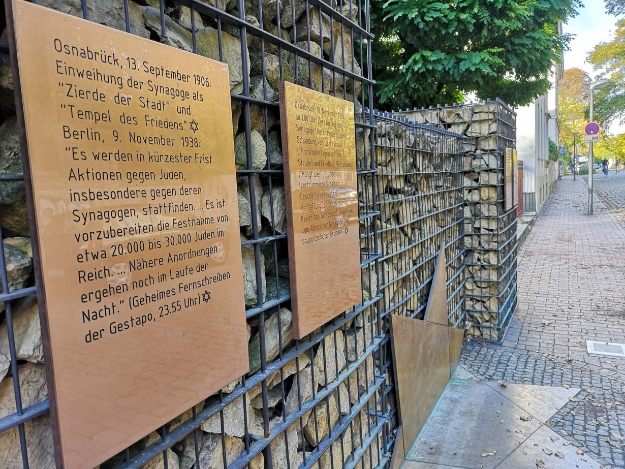 Im November 2004 wurde am Standort des zerstörten jüdischen Gotteshauses an der Alten-Synagogen-Straße ein neues Mahnmal eingeweiht, an dessen Erstellung mehrere Schulen und Unternehmen Osnabrücks aktiv mitgewirkt haben. Auf vier dort angebrachten Bronzetafeln sind grundlegende Informationen zur Verfolgungsgeschichte fixiert.
