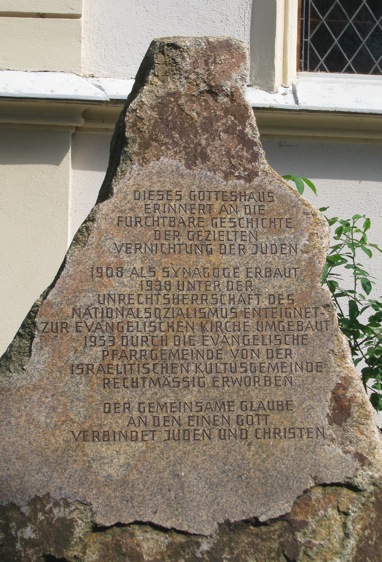 „Dieses Gotteshaus erinnert an die furchtbare Geschichte der gezielten Vernichtung der Juden. 1908 als Synagoge erbaut, 1938 unter der Unrechtsherrschaft des Nationalsozialismus enteignet – zur evangelischen Kirche umgebaut. 1953 durch die Evangelische Pfarrgemeinde von der Israelitischen Kultusgemeinde rechtmäßig erworben.